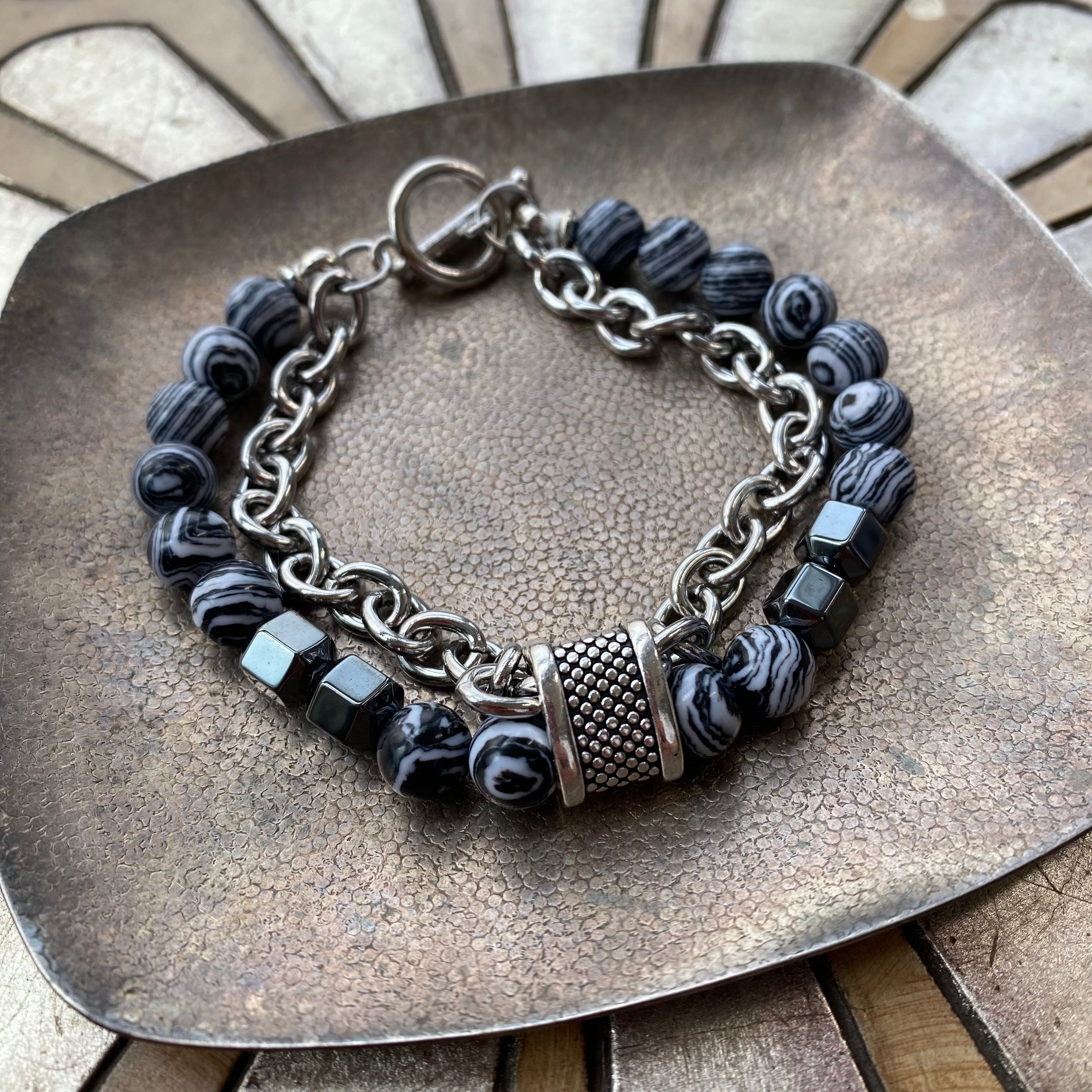 重量感あるチタン銅チェーンと個性的なビーズを組み合わせたブレスレット。