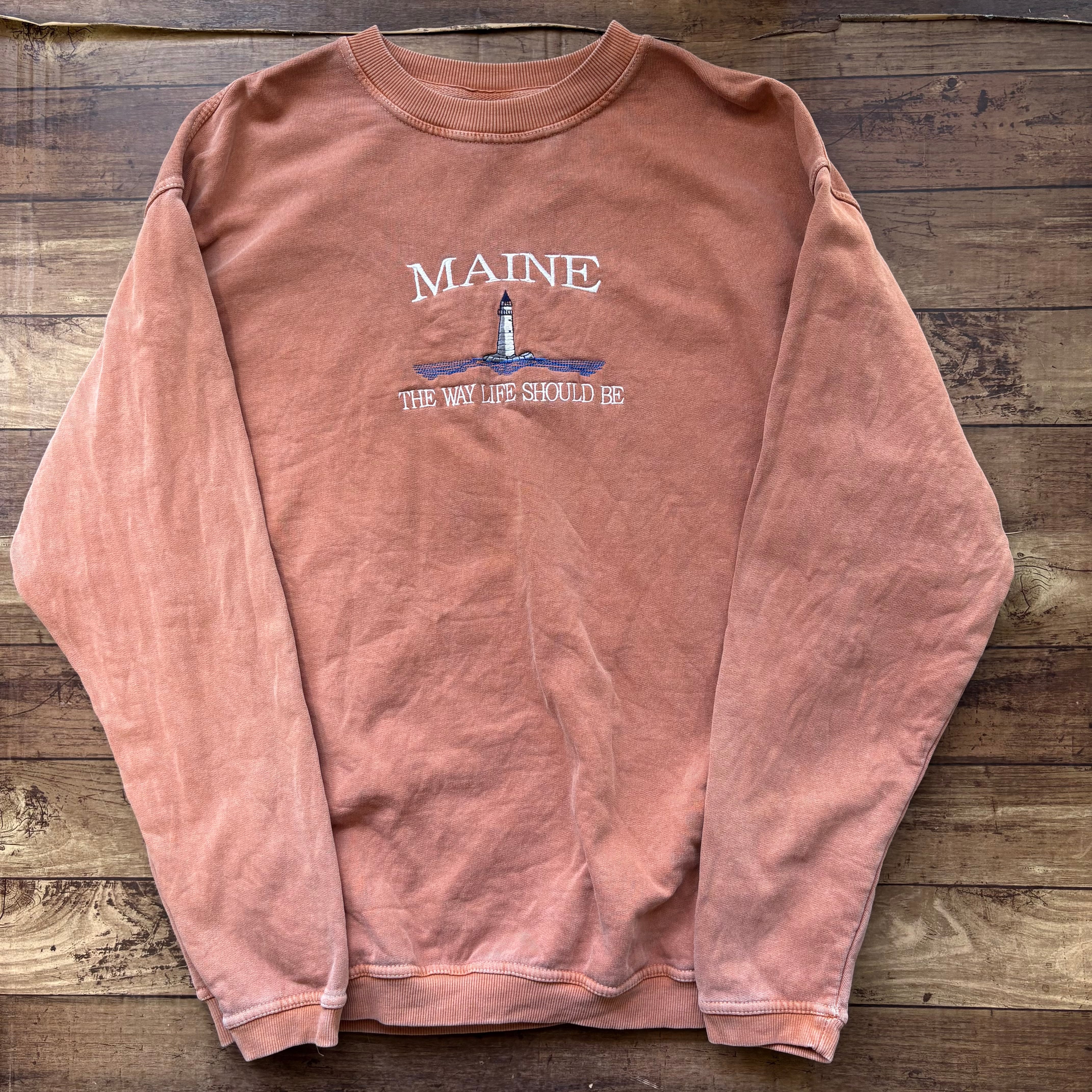 ウォッシュのかかったブラウンカラーのボディに、フロントには「MAINE」の刺繍と灯台モチーフが施された存在感のあるデザイン。