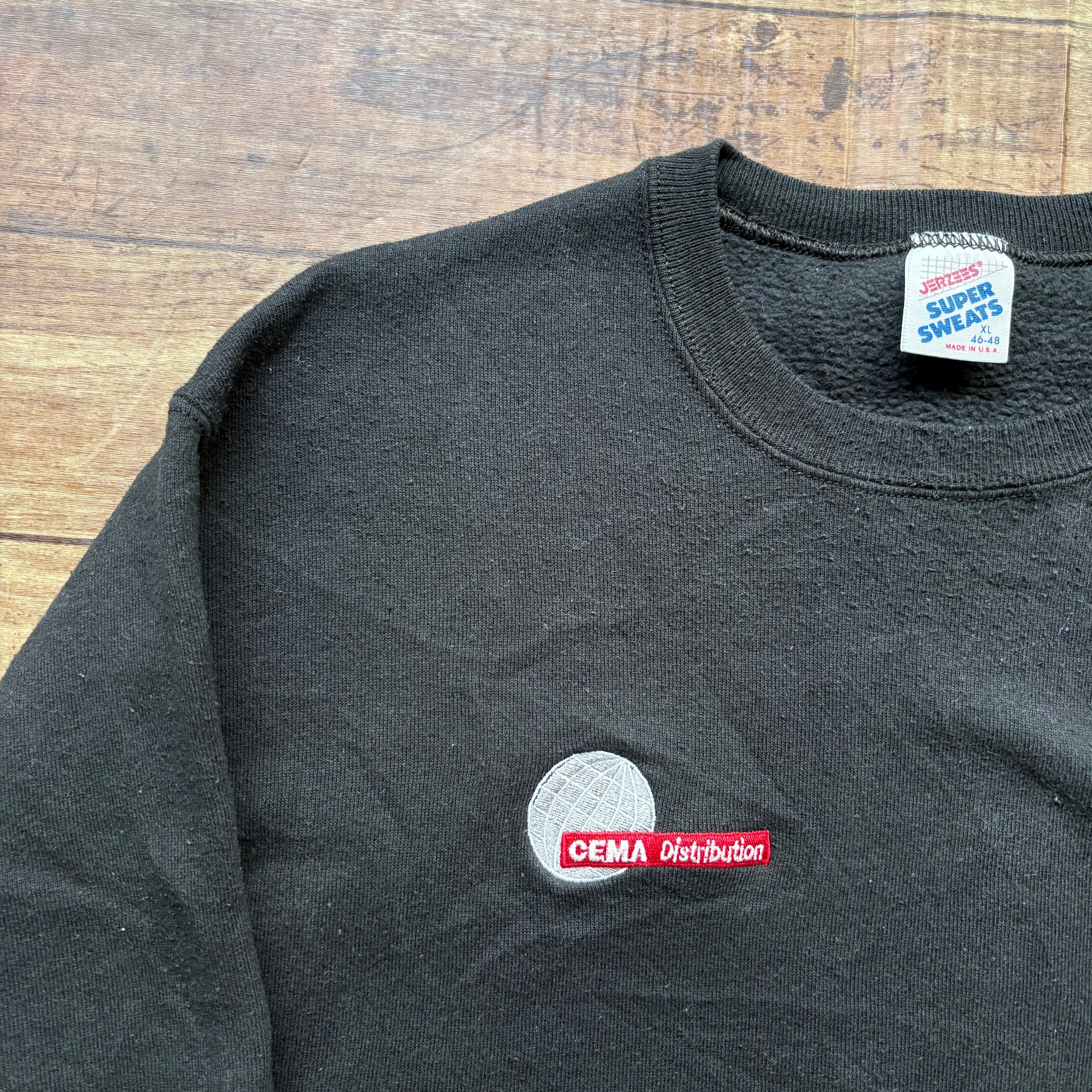 フロント左胸には「CEMA Distribution」の刺繍ロゴが入り、シンプルながらも企業系スウェットらしい無骨な雰囲気を持つ一着です。
