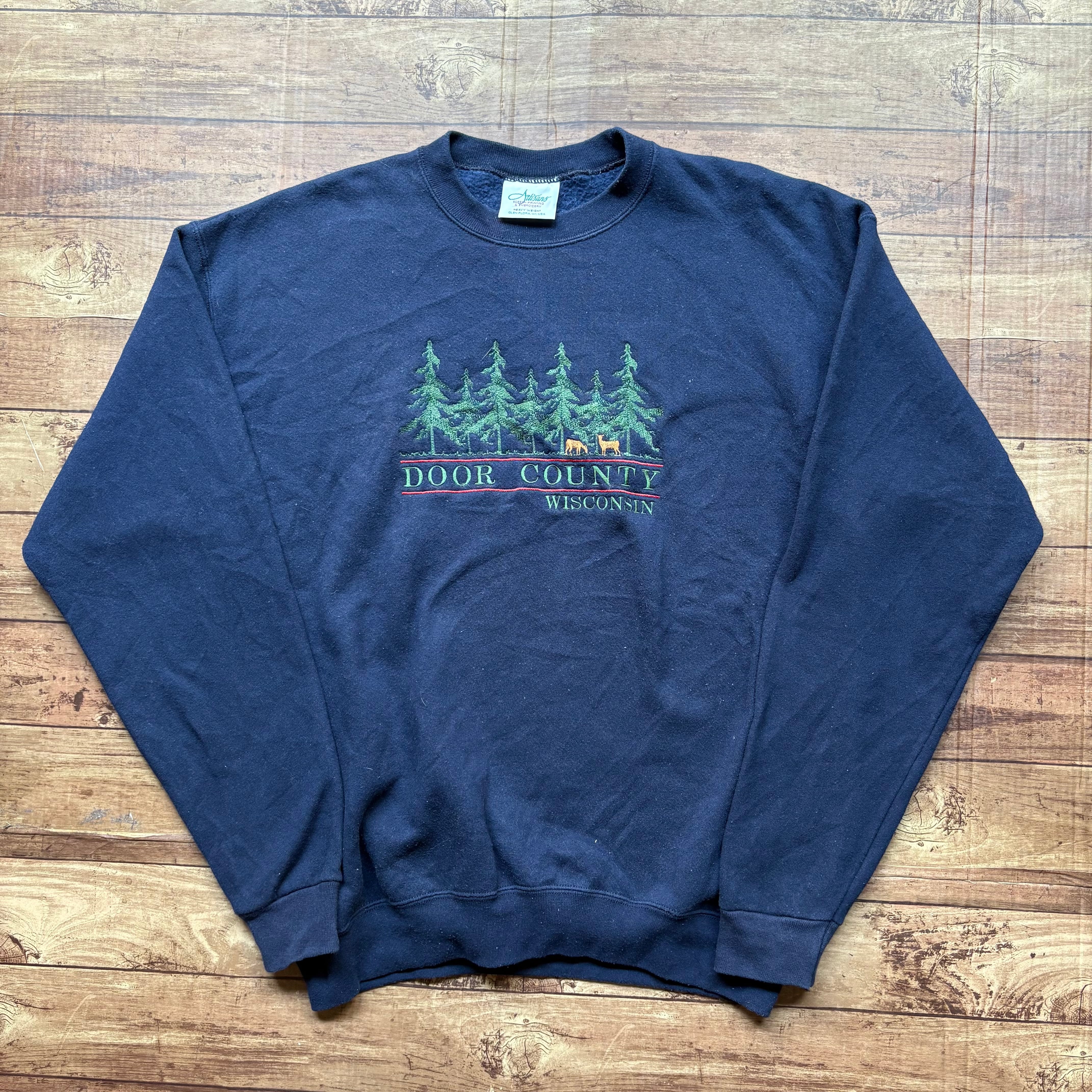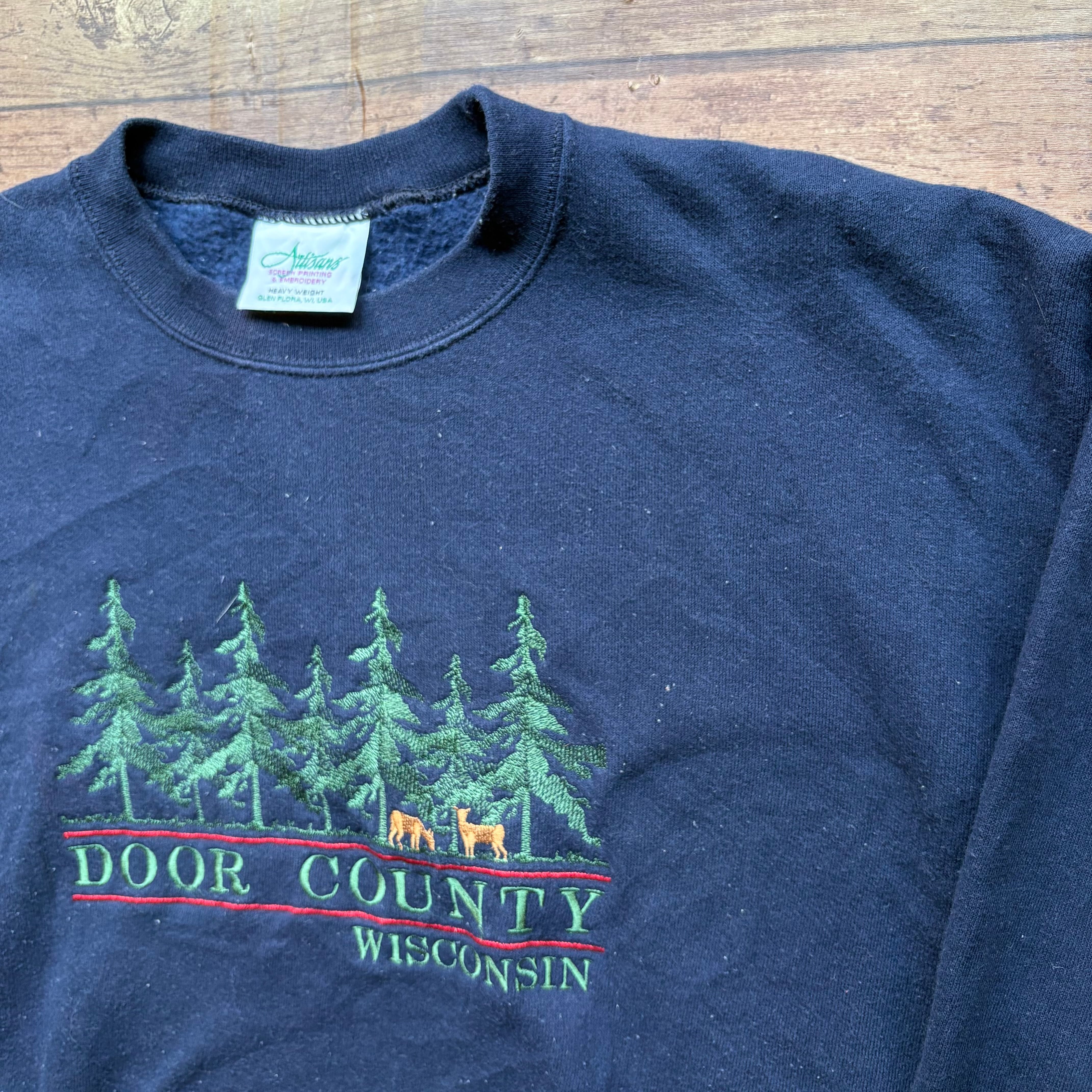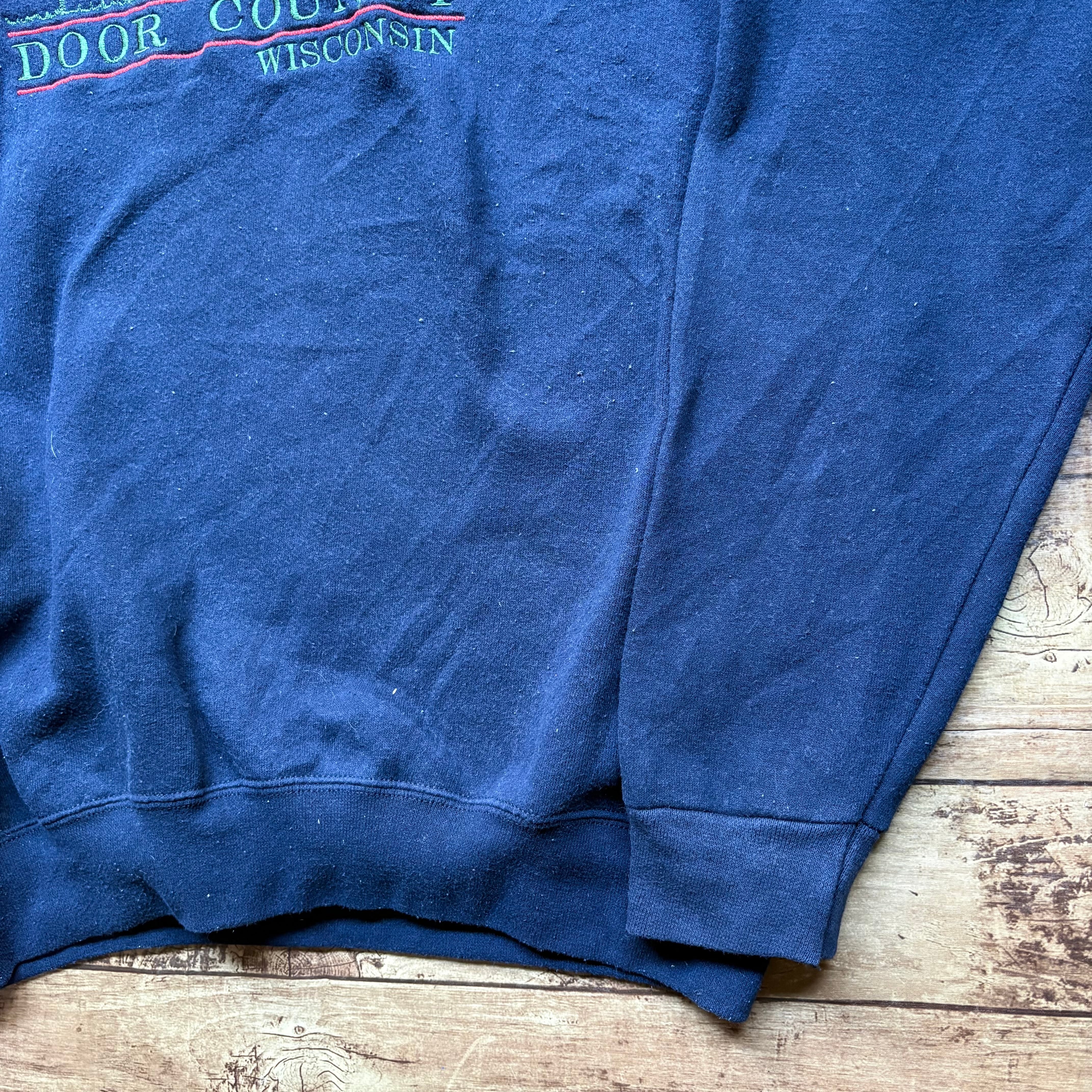 ネイビーボディに、フロントには「DOOR COUNTY WISCONSIN」の刺繍デザインが入ったスウェット。