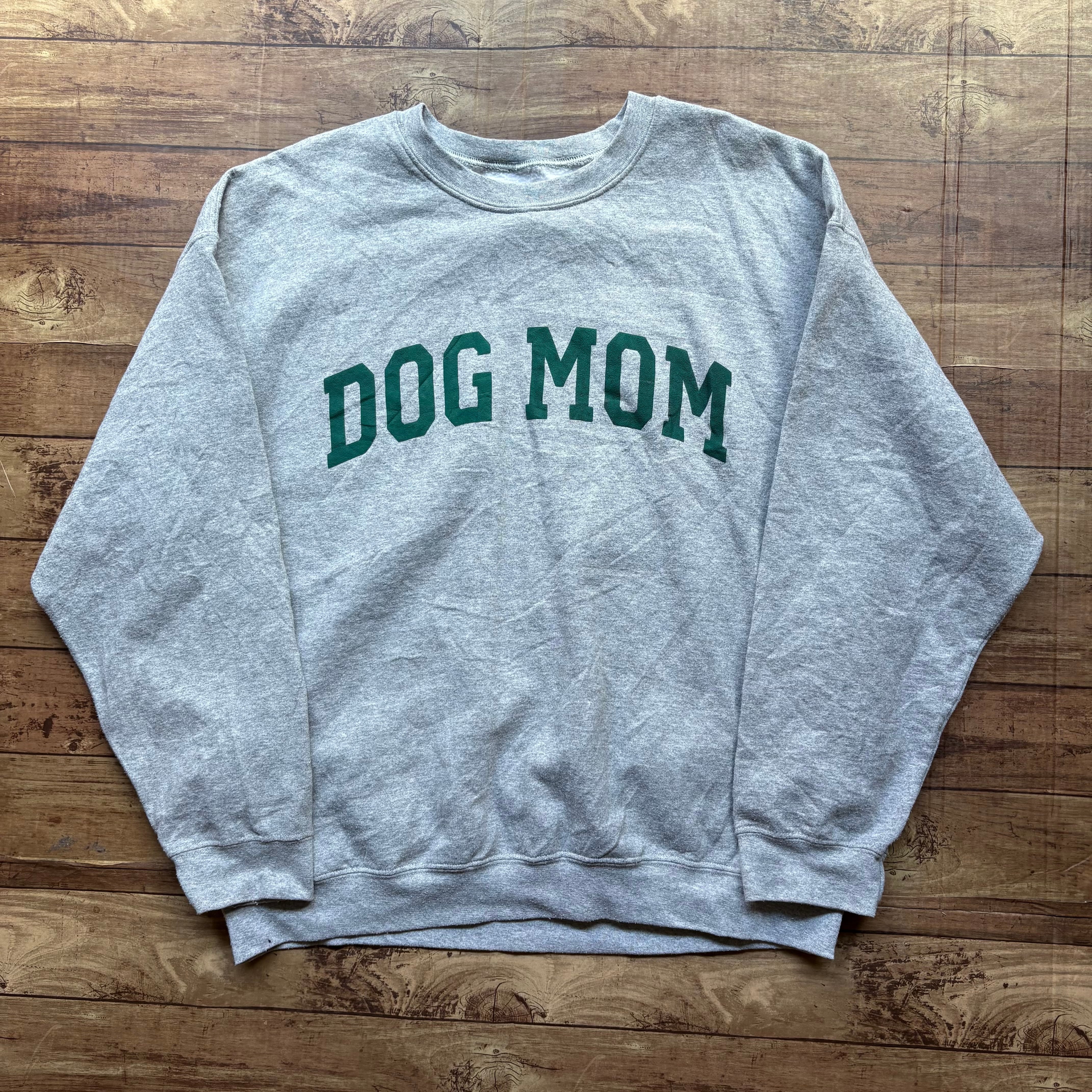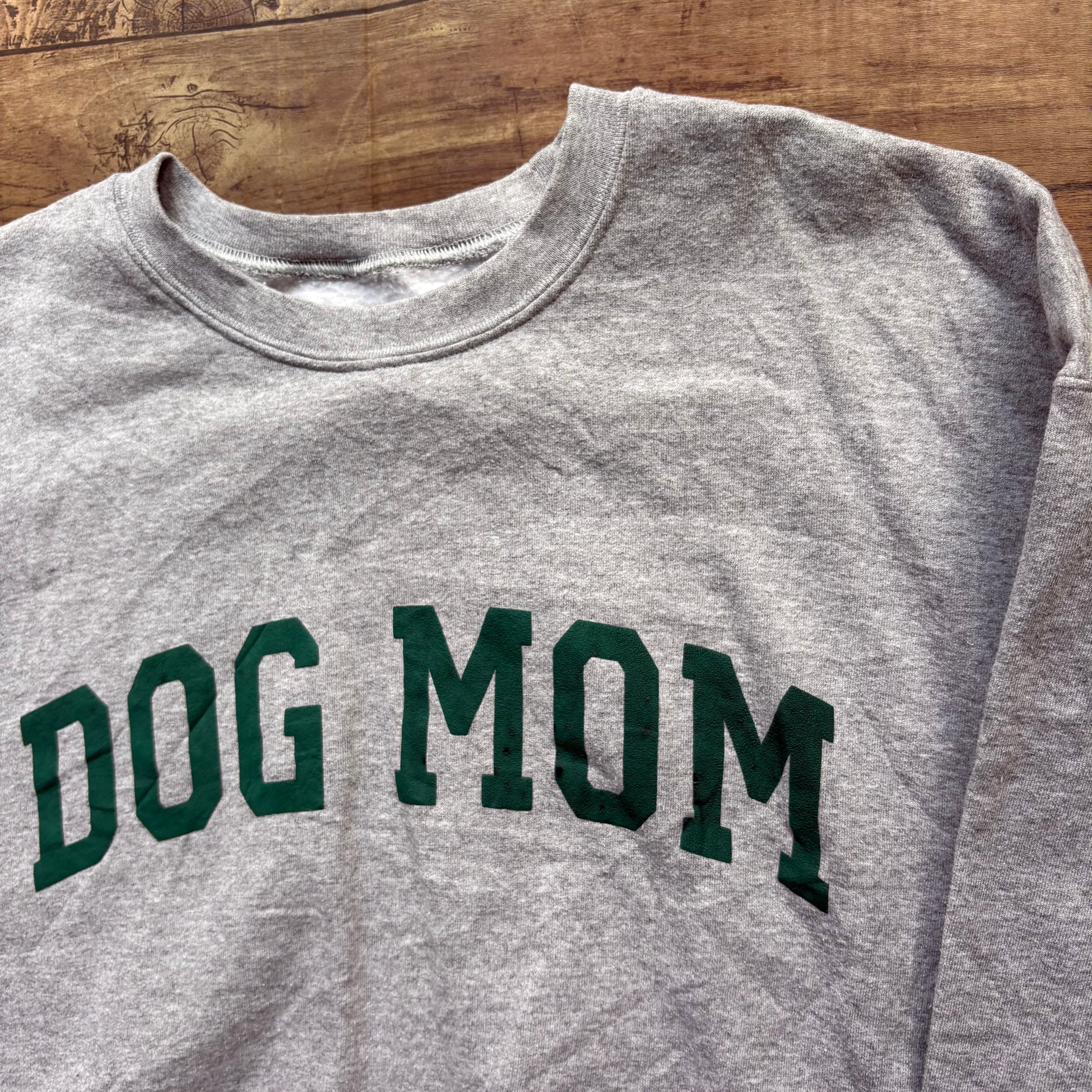 グレーボディに、フロントにはグリーンの「DOG MOM」プリントが入ったスウェット。