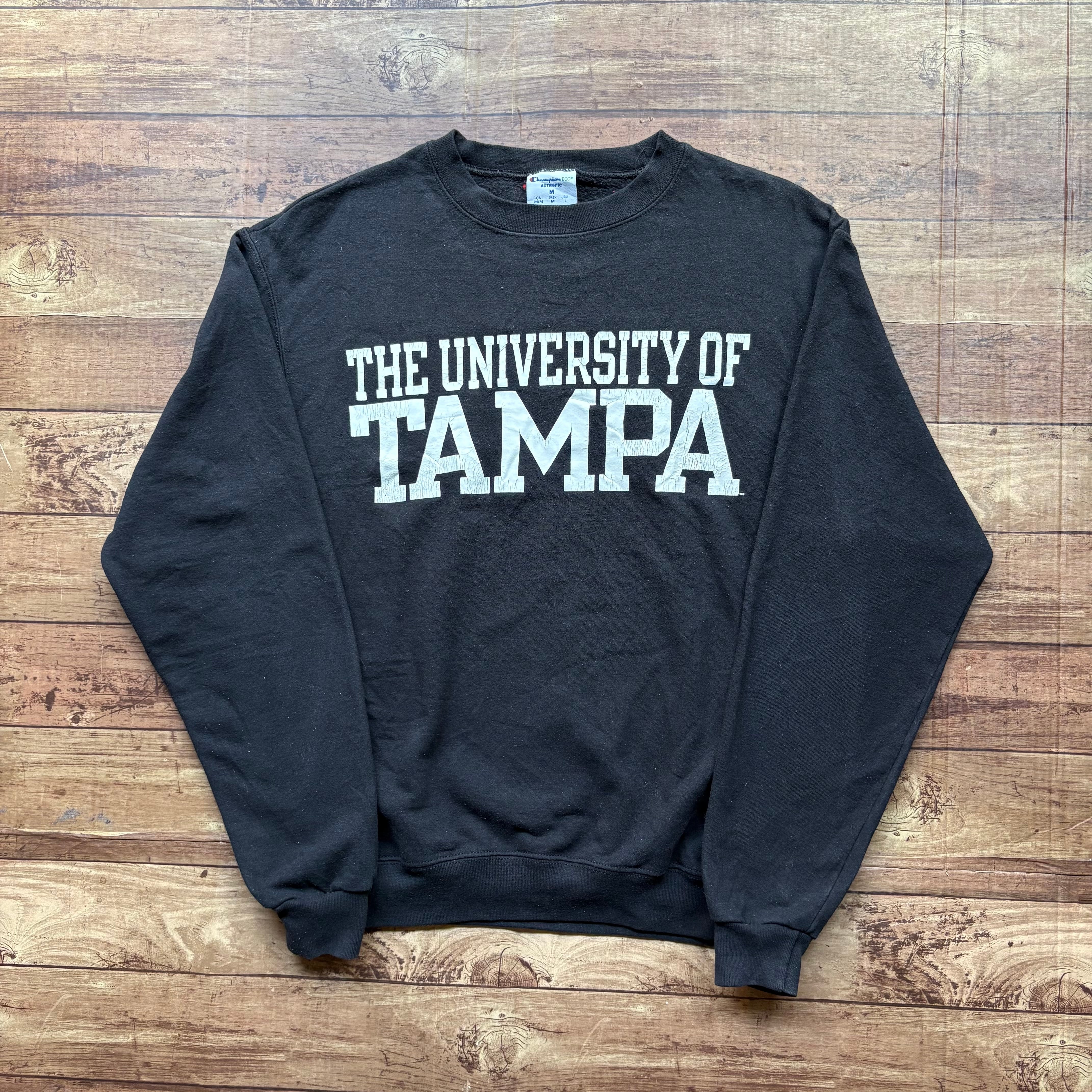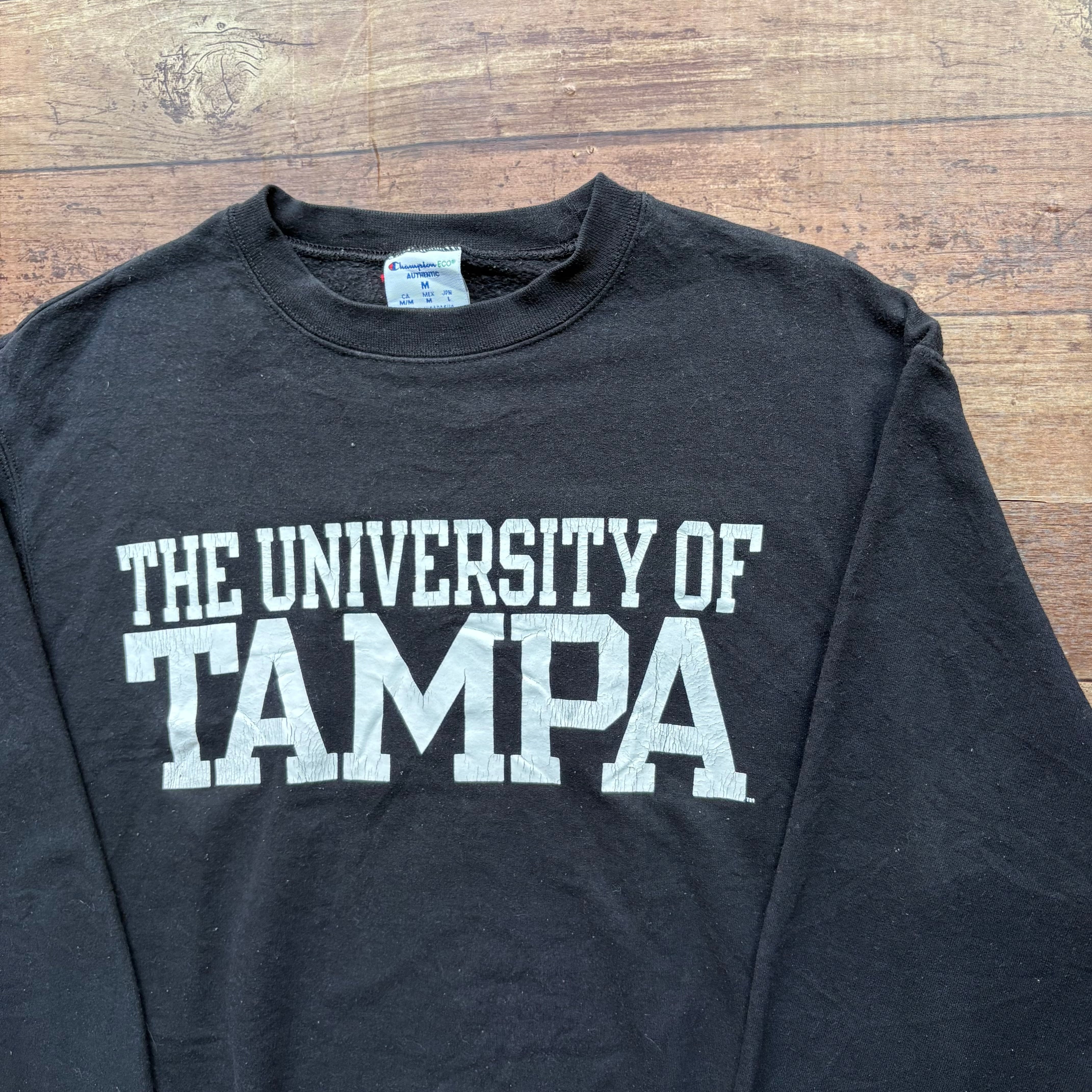 ブラックボディに、フロントにはホワイトの「THE UNIVERSITY OF TAMPA」カレッジプリントが入ったスウェット。