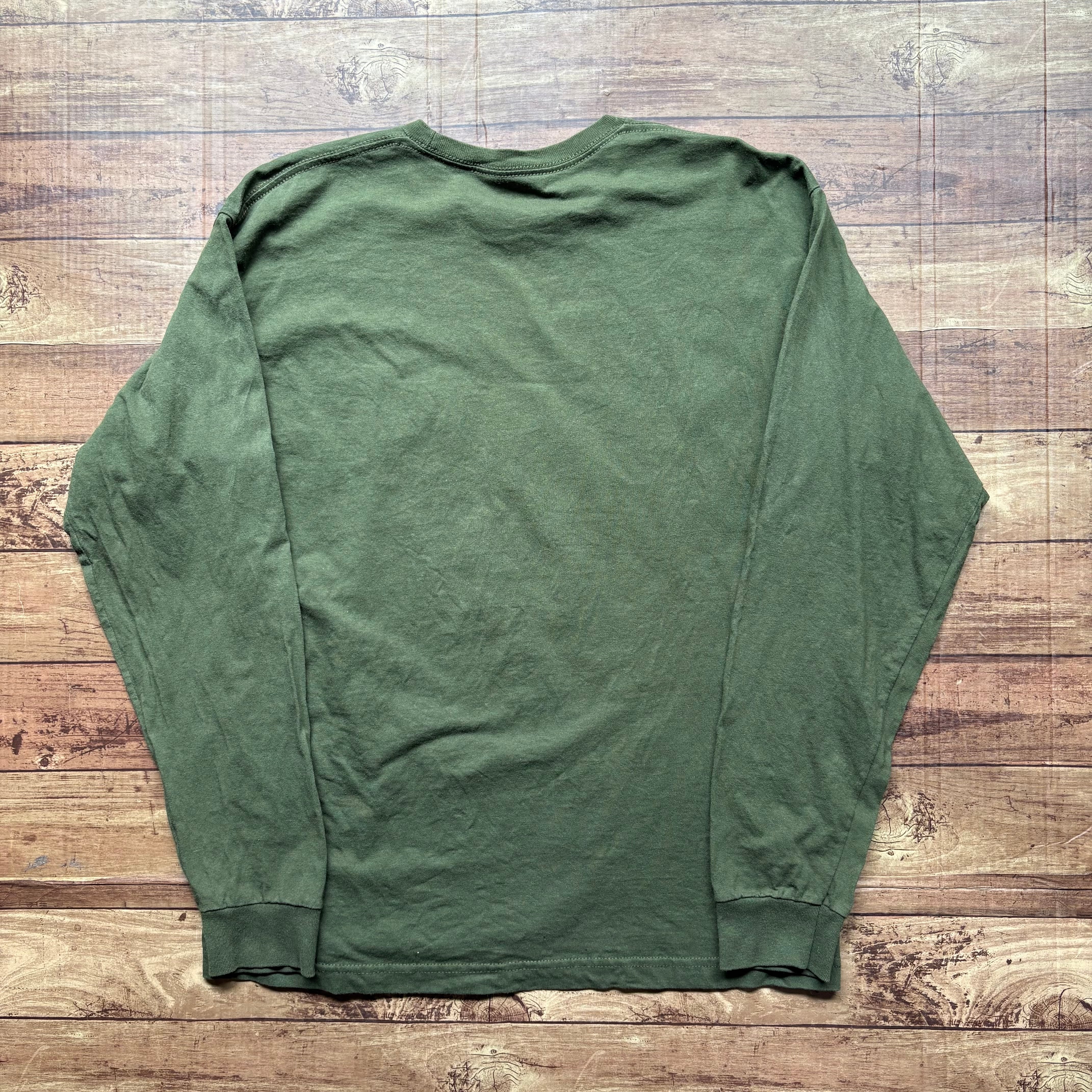 オリーブグリーンボディに、「DON’T TREAD ON ME」のメッセージとスネークモチーフがプリントされたロングスリーブTシャツ。