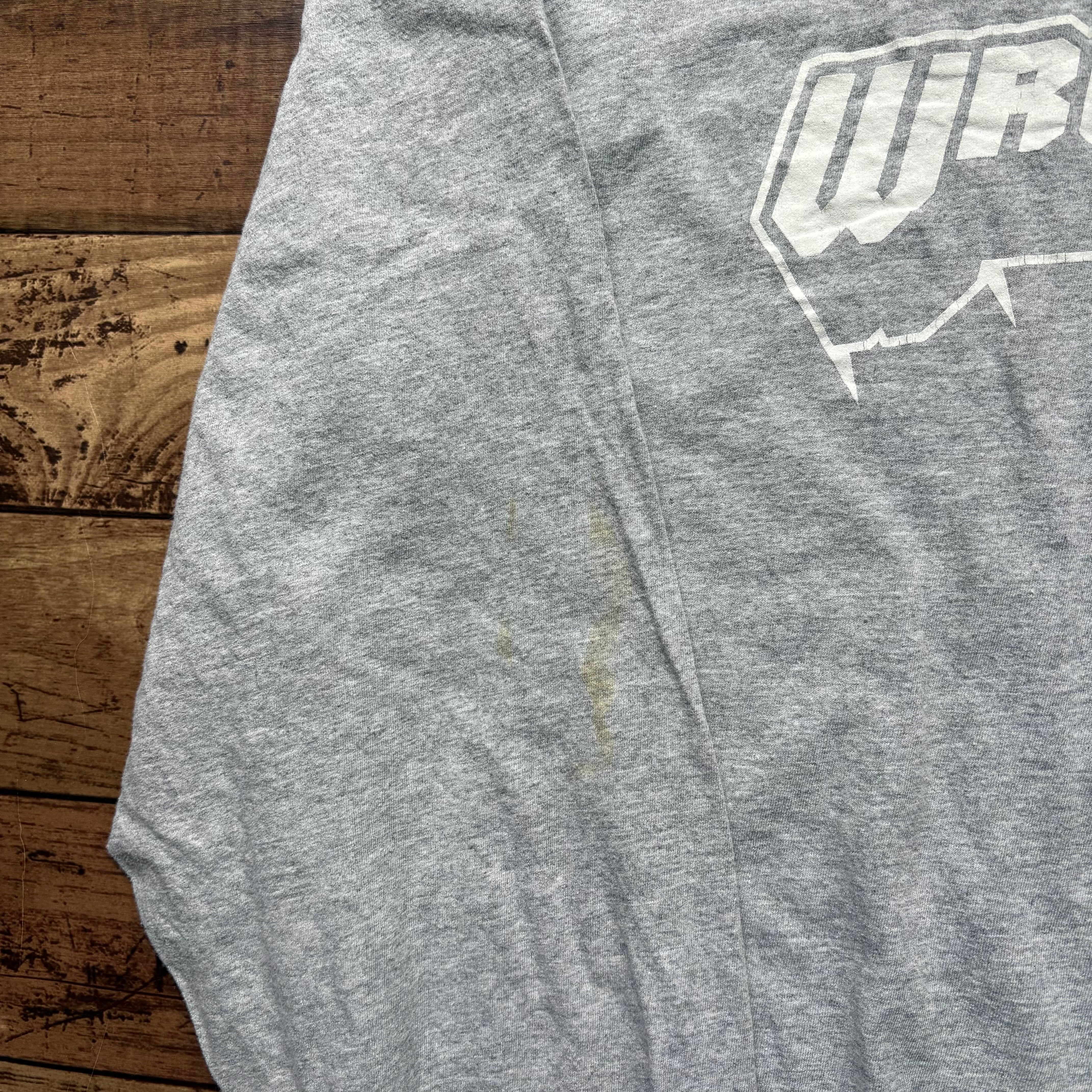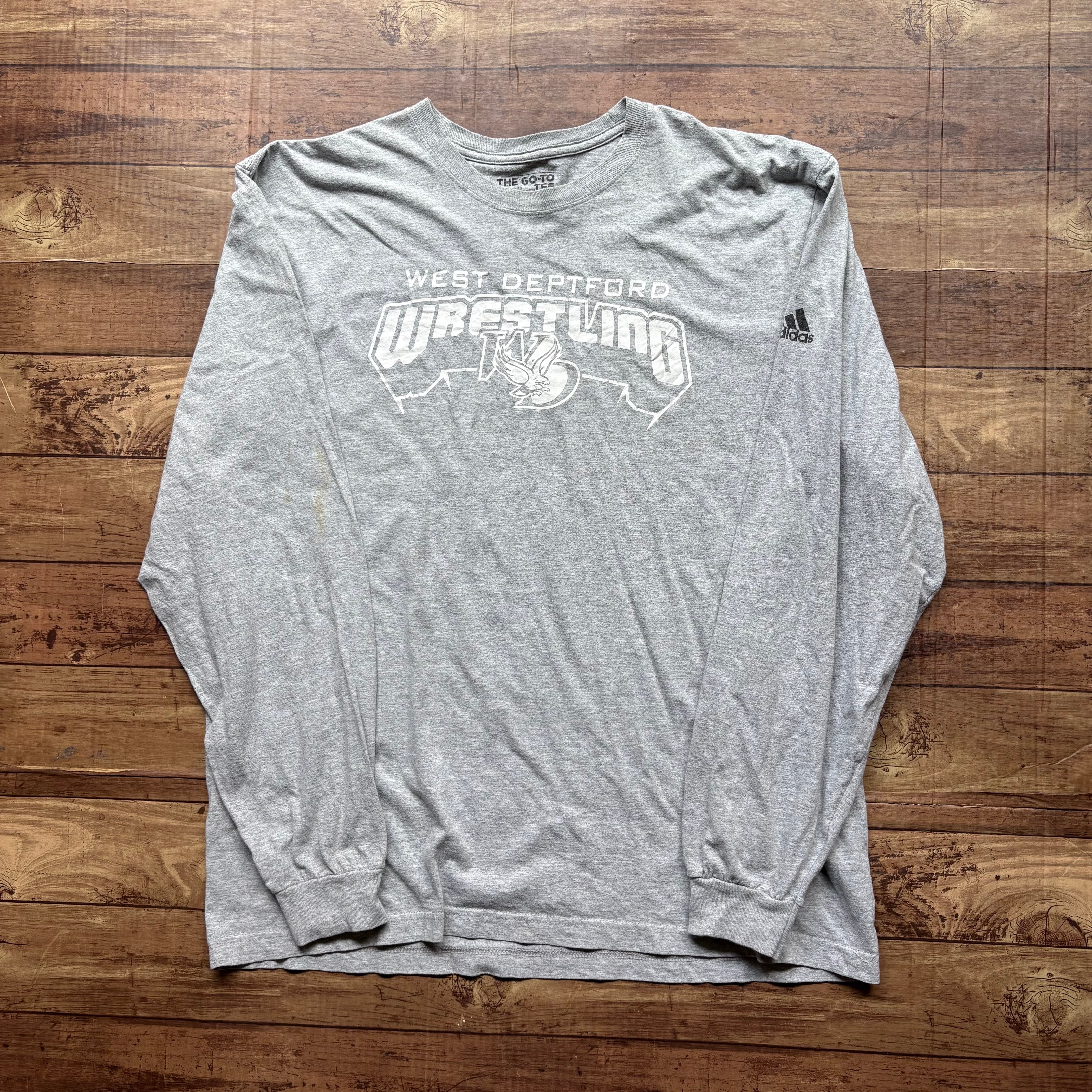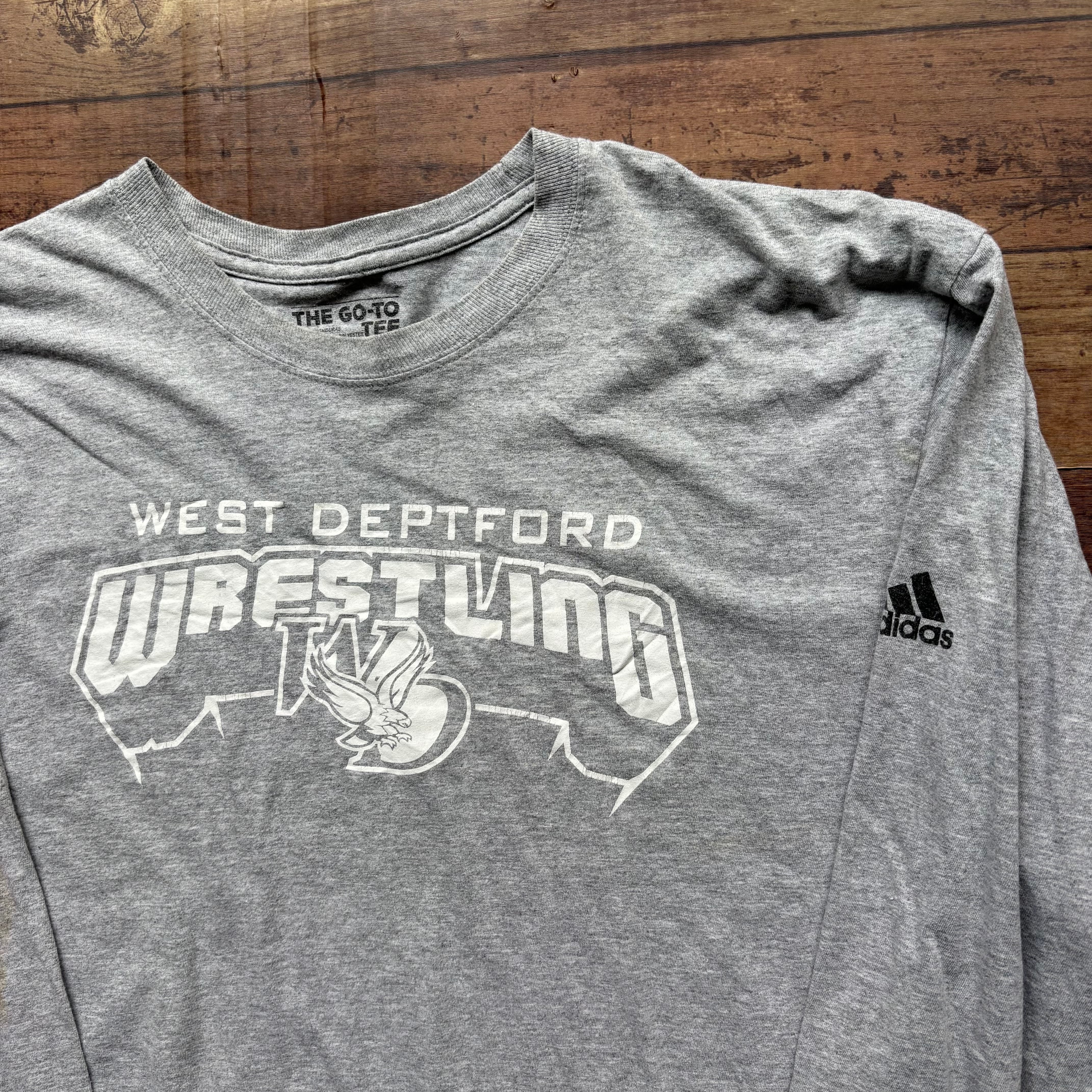 グレーボディに、「WEST DEPTFORD WRESTLING」のカレッジプリントが入ったロングスリーブTシャツ。