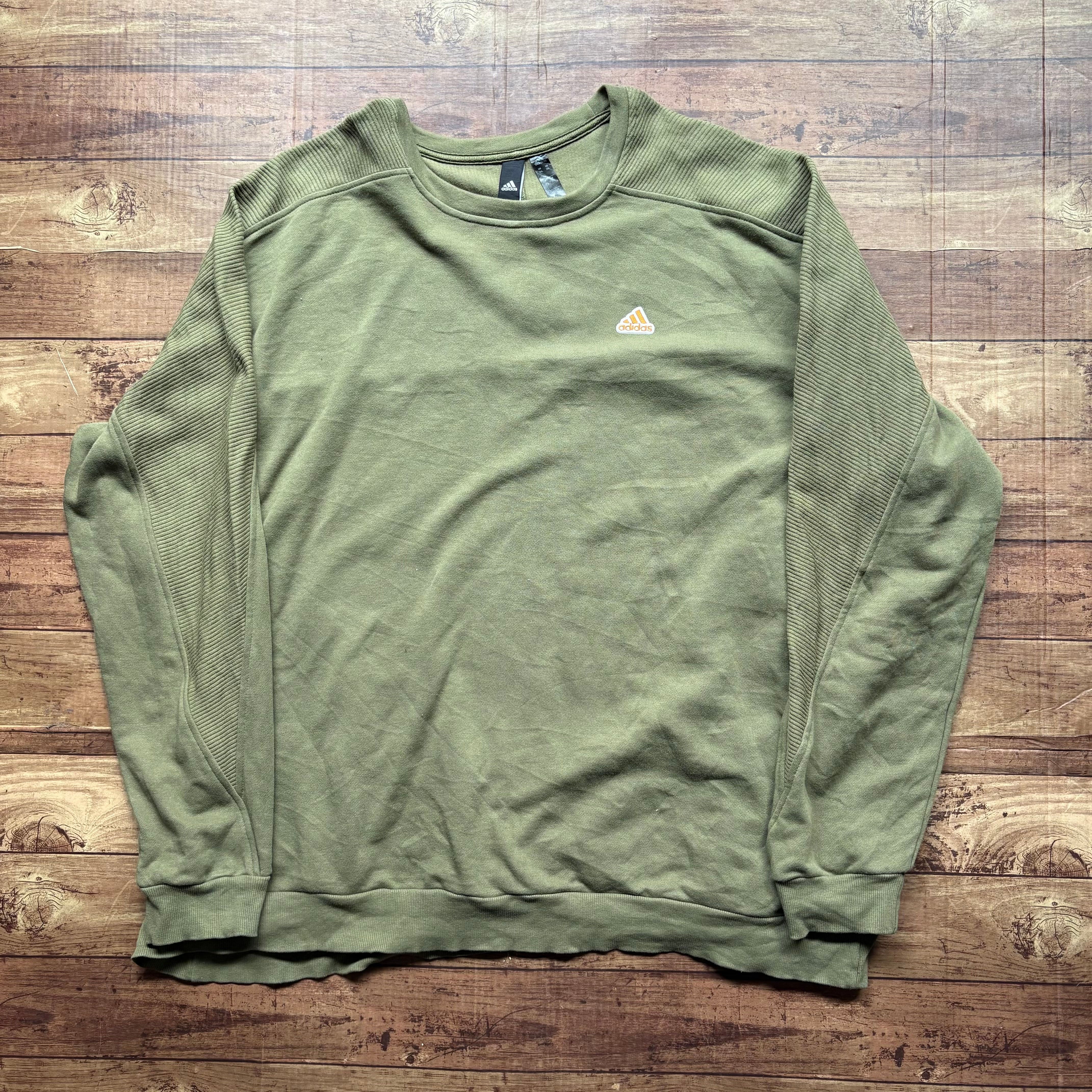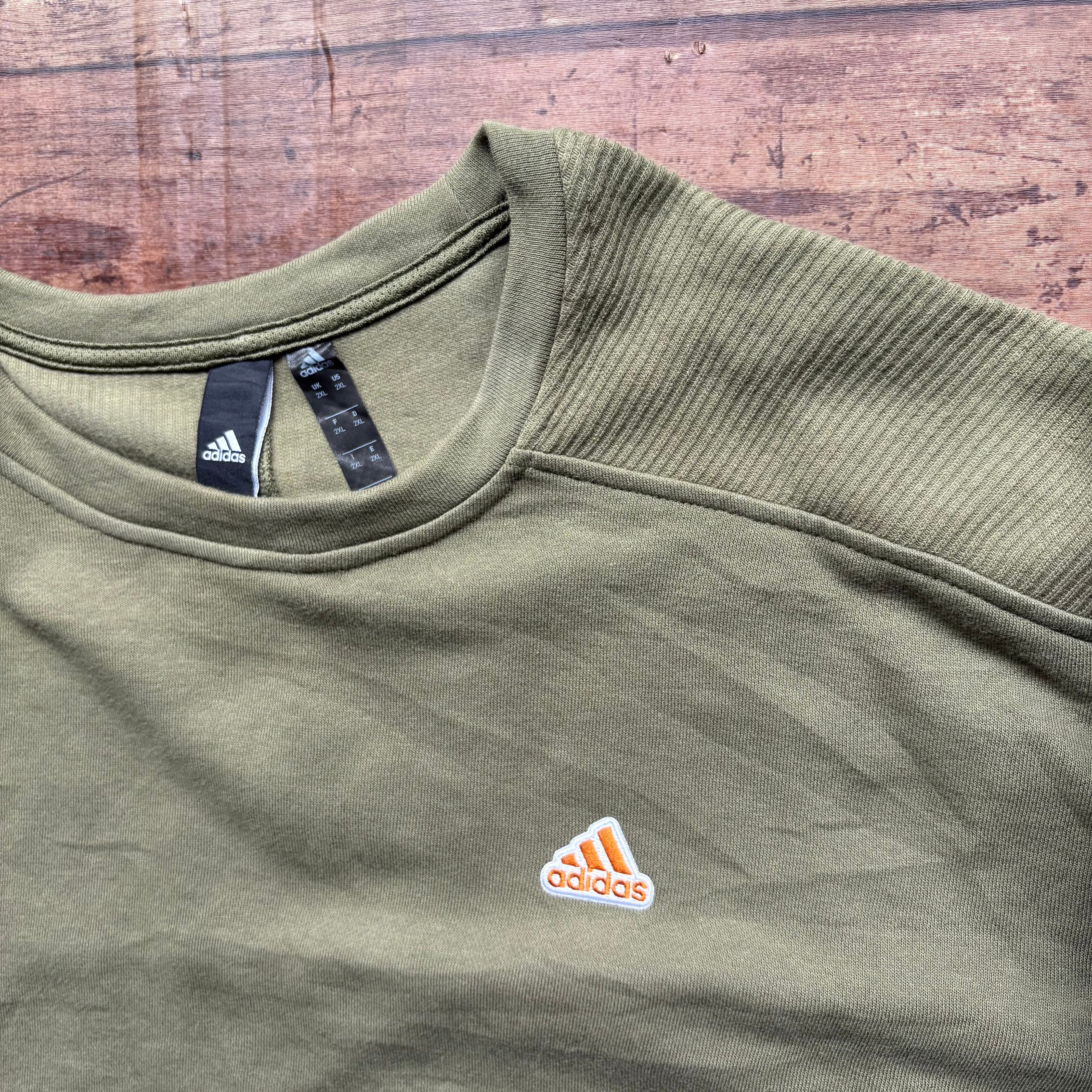 オリーブグリーンのボディに、フロントにはオレンジのadidasロゴ刺繍が入ったスウェット。